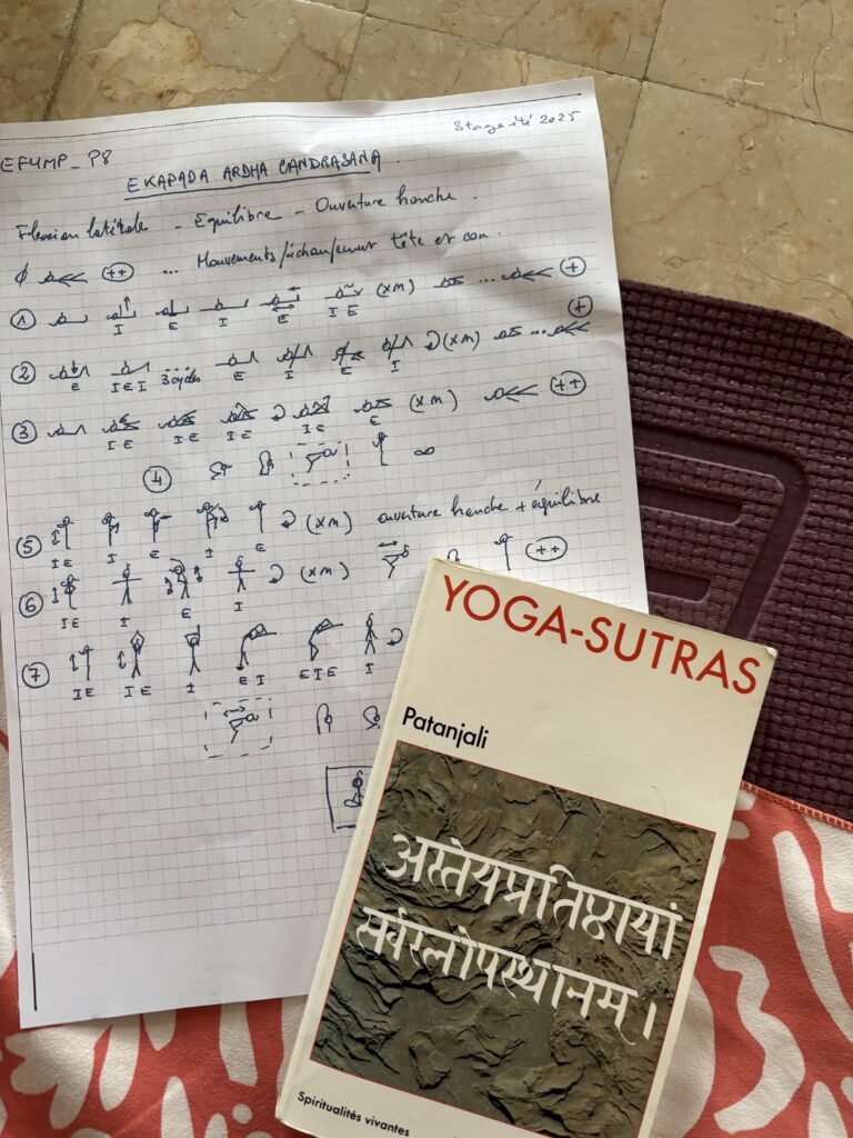 À l’EFYMP, cette philosophie se traduit par une pédagogie qui fait dialoguer la pratique et la réflexion. Les Sutras orientent la pratique sur le tapis ; en retour, la pratique vivante éclaire la compréhension du texte. Ce va-et-vient constant permet à chaque élève de développer une expérience personnelle, concrète et évolutive du yoga.